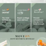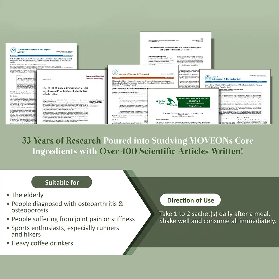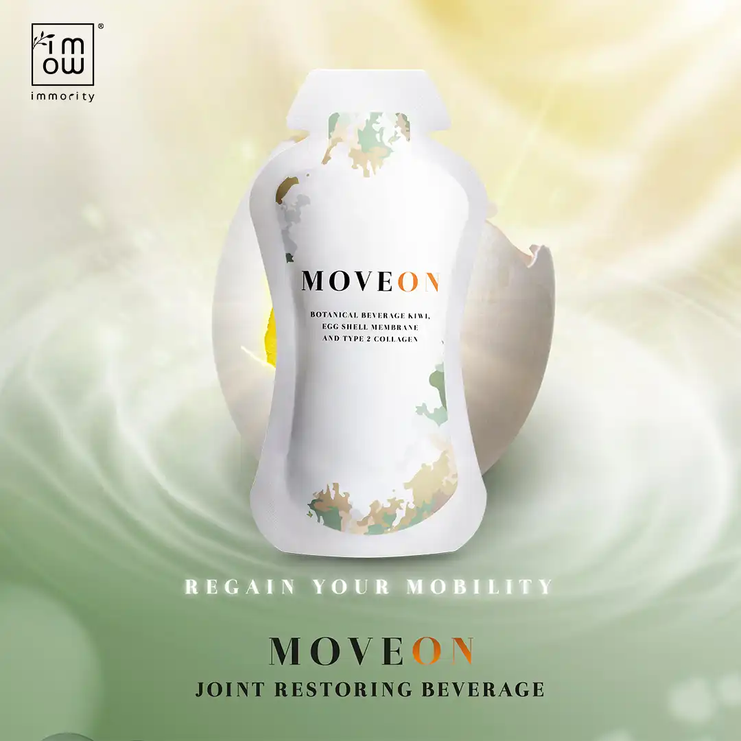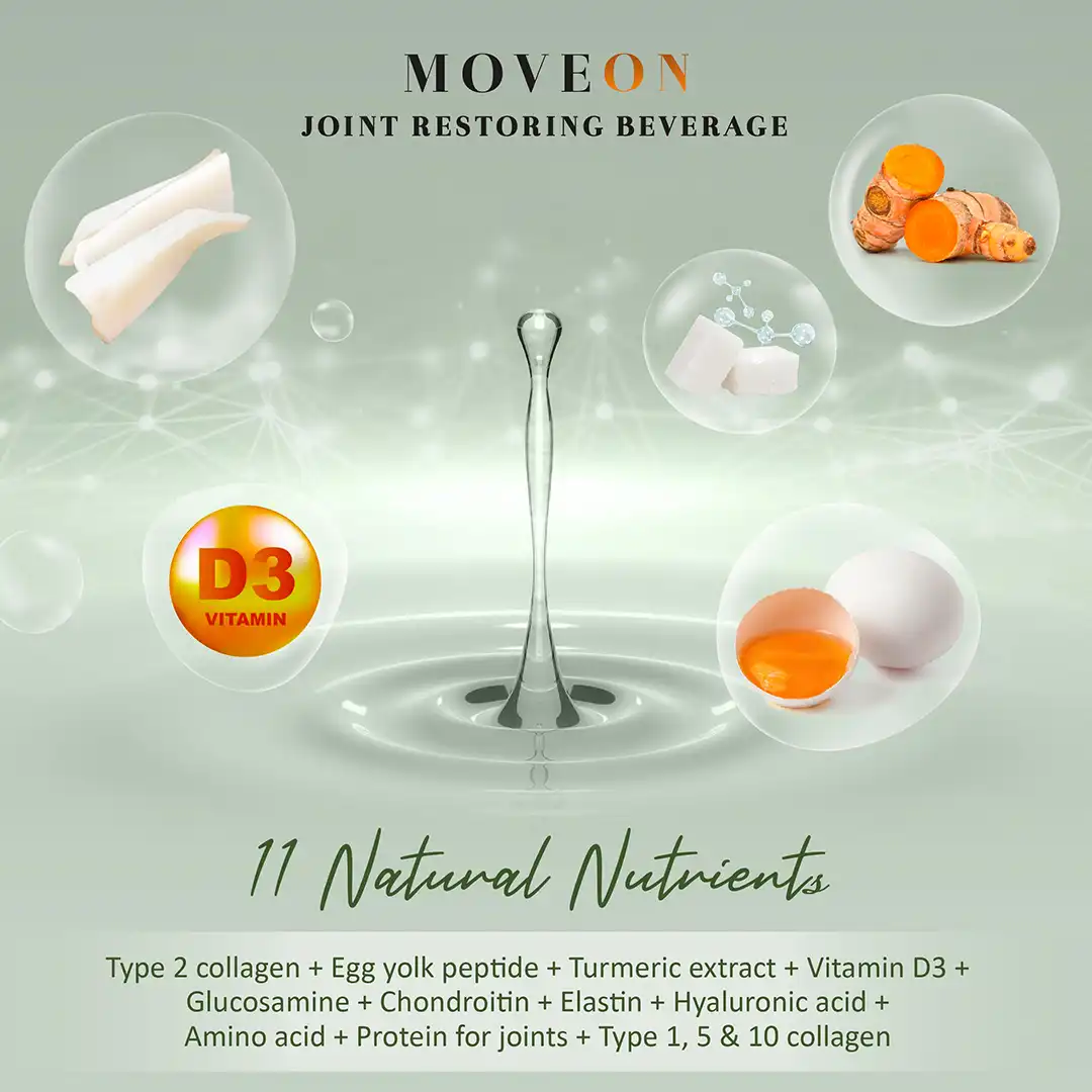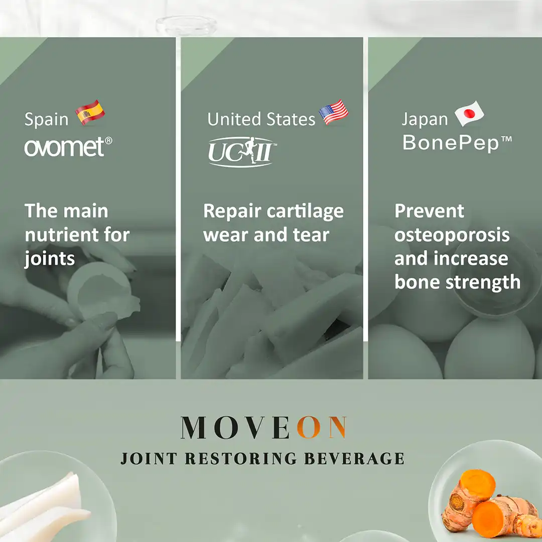 MOVEON is an 11-in-1 joint restoring beverage that strengthens joints and promotes bone health. MOVEON can help to repair, regenerate and strengthen cartilage, tendon and ligament health and increase bone density. It is formulated by 3 main patented ingredients, including Ovomet® Eggshell Membrane, UCII™ Undenatured Type 2 Collagen, BonePep™ Hydrolyzed Yolk Peptide, which protect joint health (including muscles, bones, ligaments, tendons, cartilage and synovial fluid).