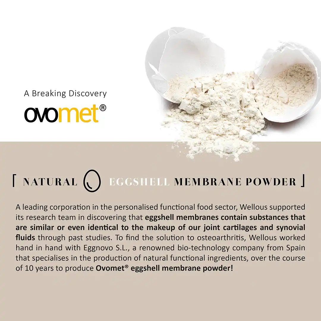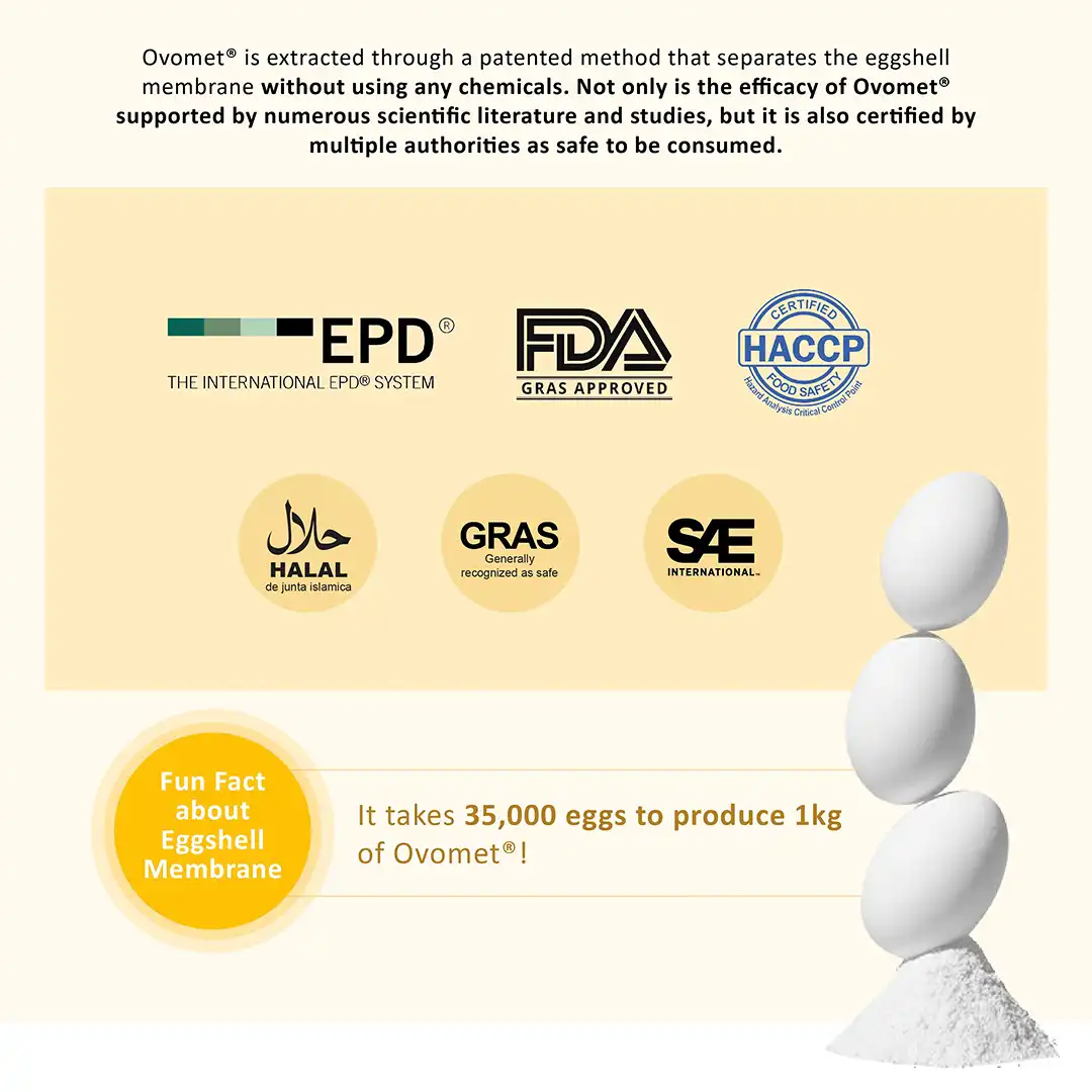Ovomet® is not only rich in collagen but also retains more than 500 types of proteins including hyaluronic acid, glucosamine, and chondroitin sulphate which are naturally found in eggshell membranes. These substances can help relieve joint discomfort, protect cartilage, and promote tendon elasticity.