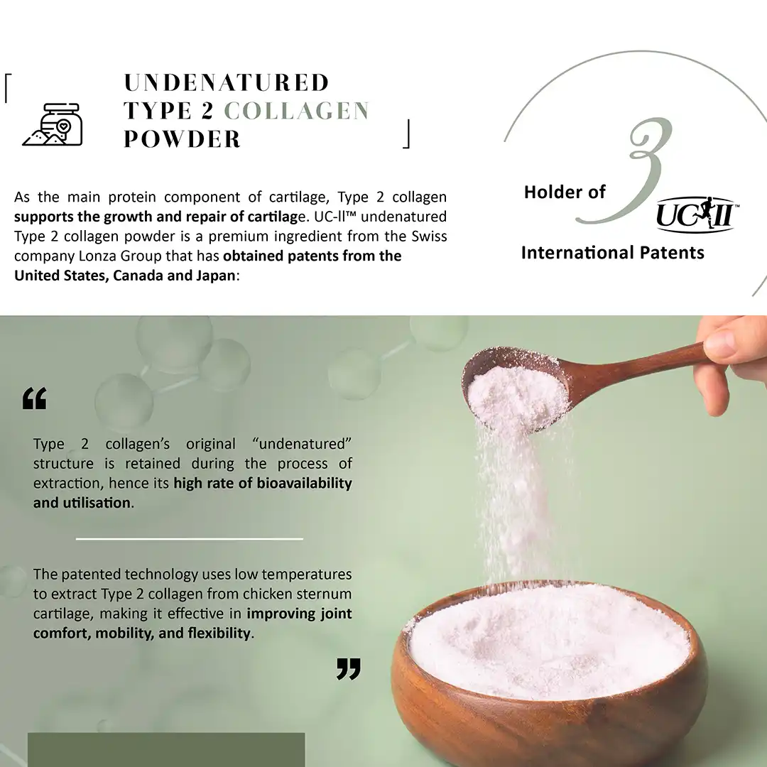 The patented technology uses low temperatures to extract Type 2 collagen from chicken sternum cartilage, making it effective in improving joint comfort, mobility, and flexibility.
