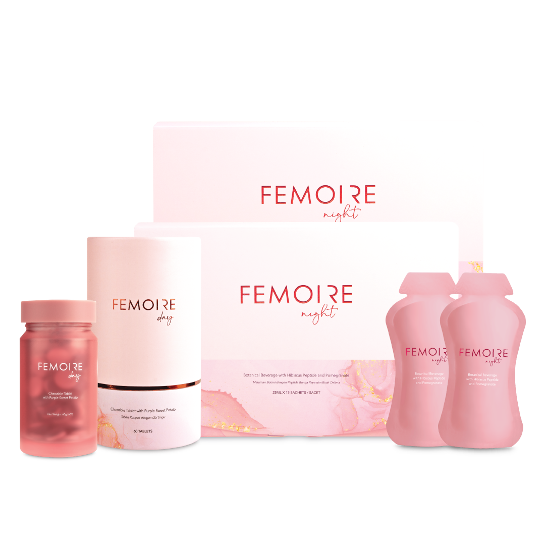 Femoire Night is a beauty beverage containing botanical extracts such as rose placenta and hibiscus collagen peptide. It is formulated to support skin health, especially skin repair and renewal.