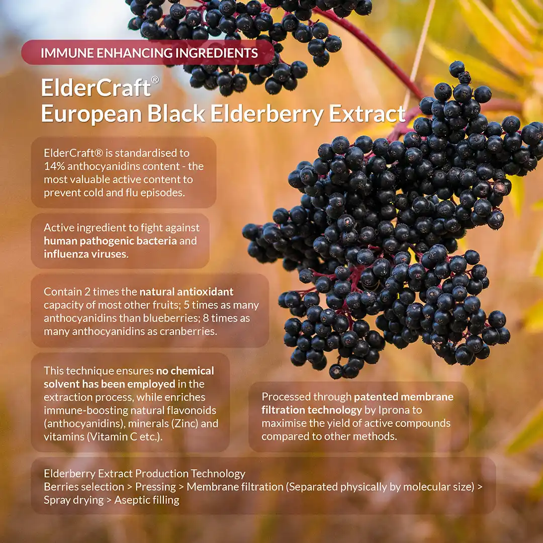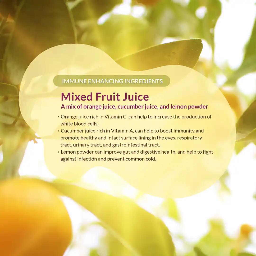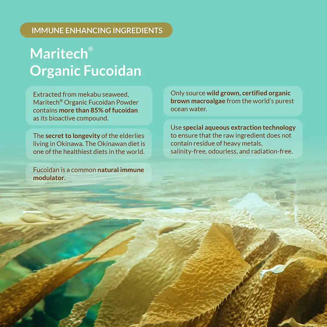 Ingredients: Black Elderberry Extract, Organic Fucoidan, Vitamin C, Maitake Mushroom Mycelium Extract, Mixed Fruit